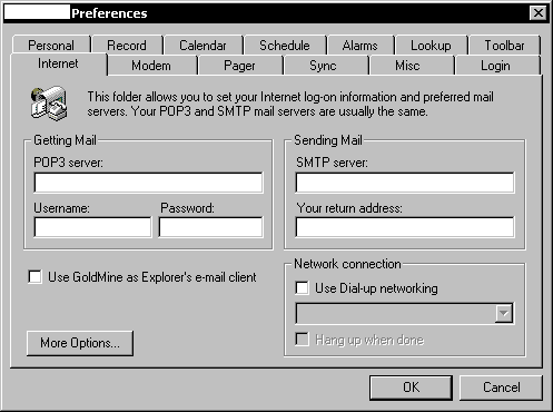 Begin by opening Goldmine and clicking the Edit menu at the top. Choose the Preferences option to get a pop-up window. Click the tab on the left towards the top where it says Internet to see the options pictured below.